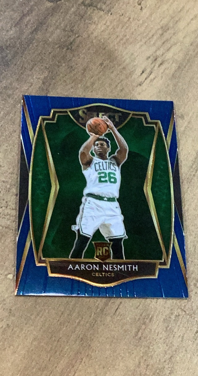 This 2020-21 Panini Select Blue Premier Level rookie card of Aaron Nesmith is a premium collectible for Boston Celtics fans, showcasing a sharpshooting young wing!