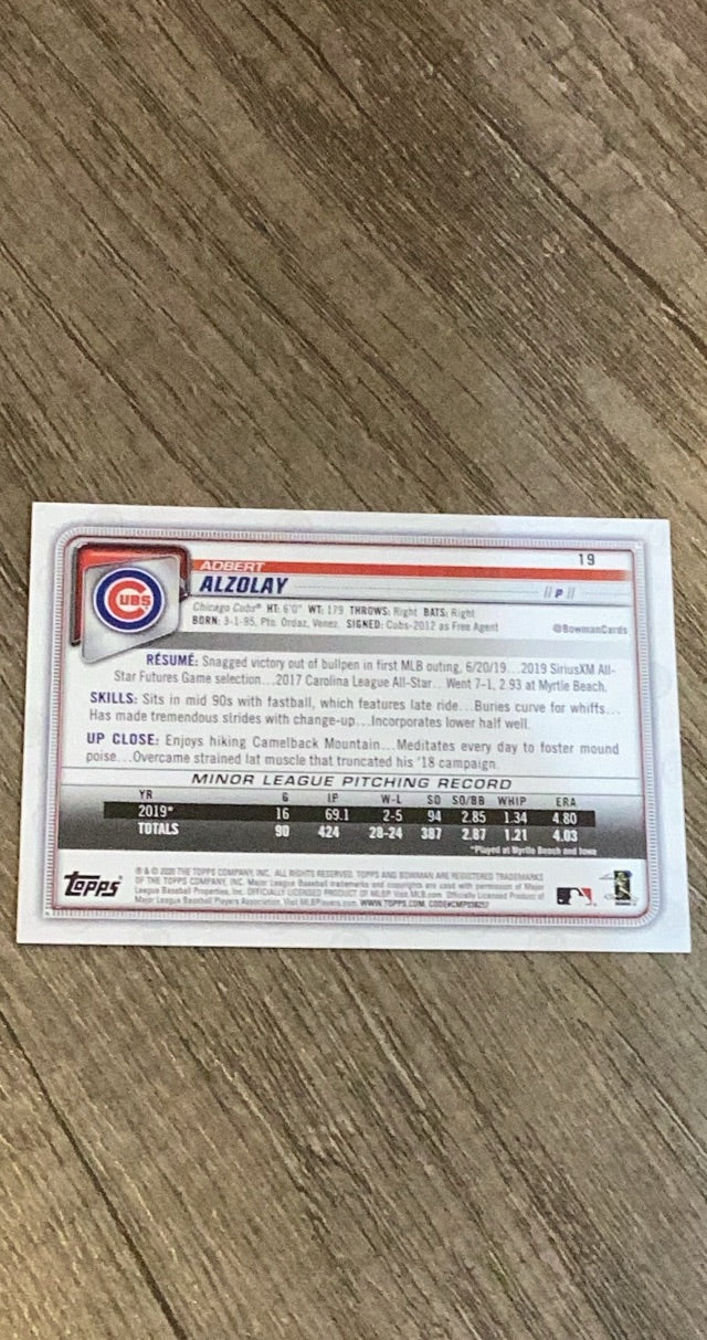 Adbert Alzolay 2020 Bowman Orange trading card. #19