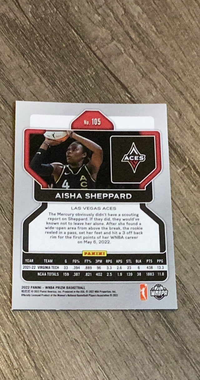 This 2022 Panini Prizm WNBA rookie card of Aisha Sheppard is a vibrant collectible for Las Vegas Aces fans, showcasing a sharpshooting guard with potential!