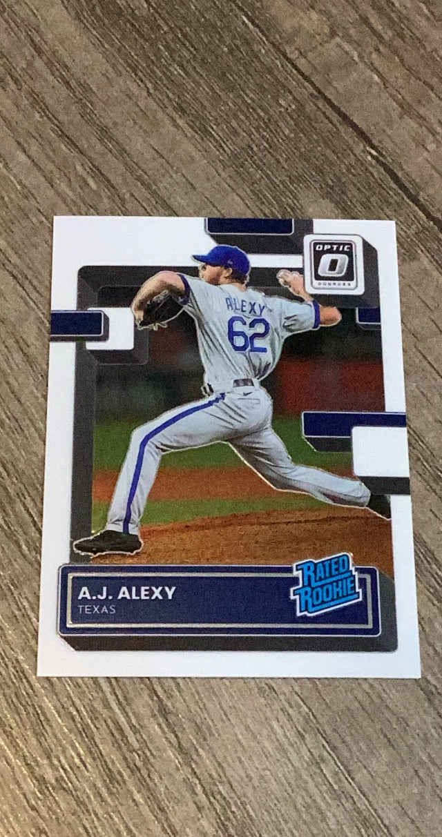 This 2022 Donruss Optic rookie card of A.J. Alexy is a vibrant collectible for Rangers fans, showcasing a talented pitcher!