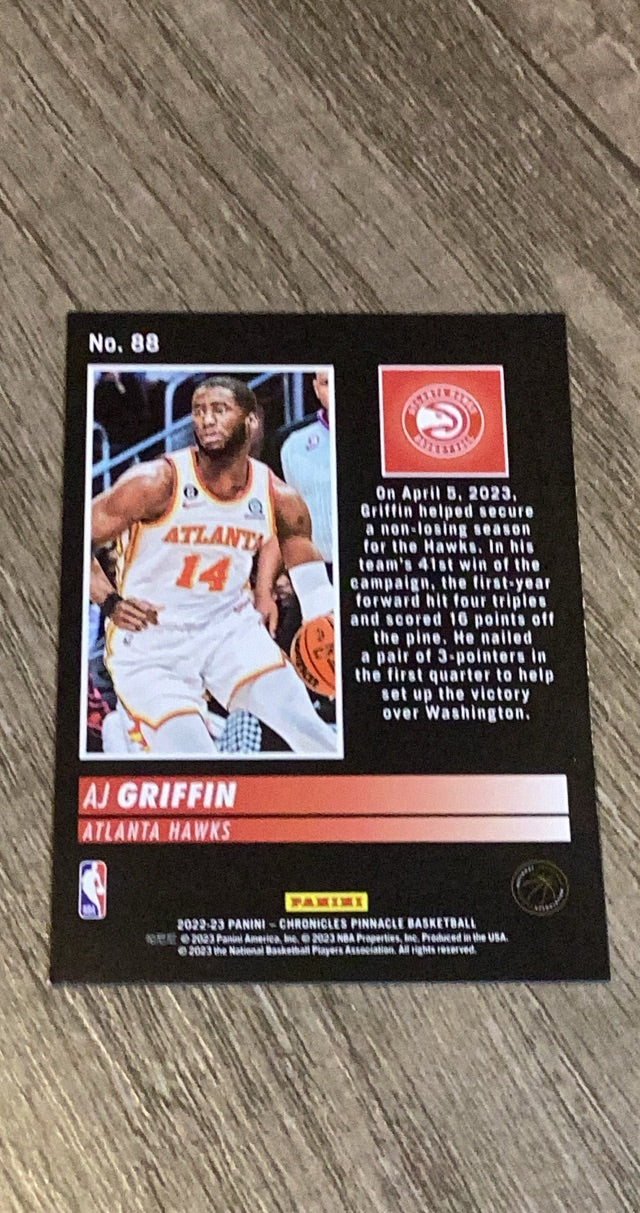 This 2022-23 Panini Chronicles Pinnacle Pink rookie card of AJ Griffin is a vibrant collectible for Atlanta Hawks fans, showcasing a sharpshooting forward with potential!