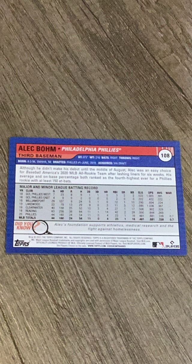 This 2021 Topps Big League rookie card of Alec Bohm is a vibrant collectible for Phillies fans, showcasing a rising star in new condition. Ideal for MLB collectors!