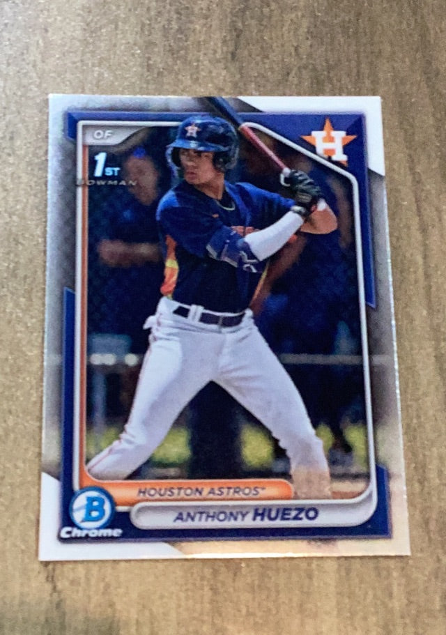 This 2024 Bowman Chrome Prospects rookie card of Anthony Huezo is a vibrant collectible for Astros fans, showcasing a rising star in new condition. Perfect for MLB collectors!
