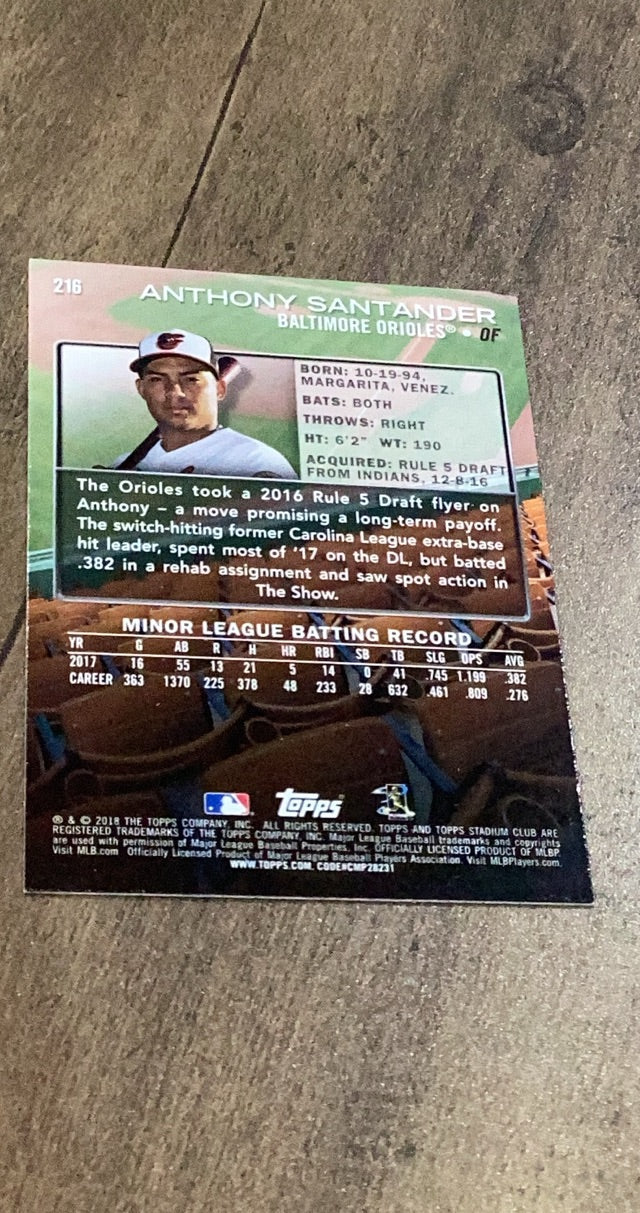 Anthony Santander 2018 Stadium Club #216 rookie card.