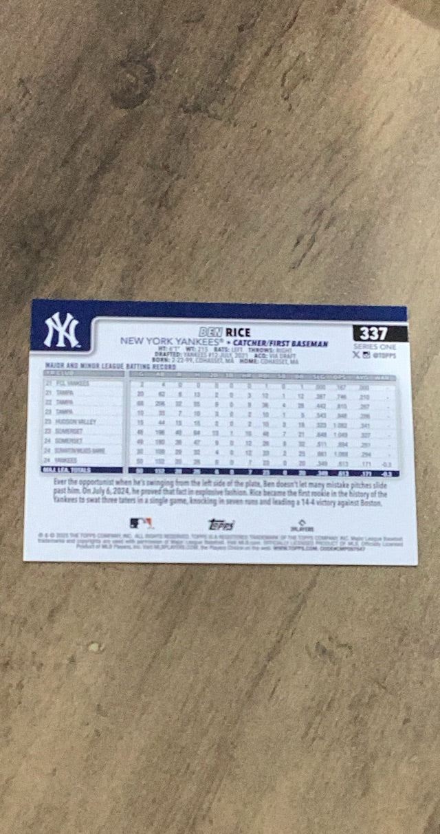 This 2025 Topps rookie card of Ben Rice is a must-have for Yankees fans featuring a rising MLB star in new condition. Perfect for collectors!
