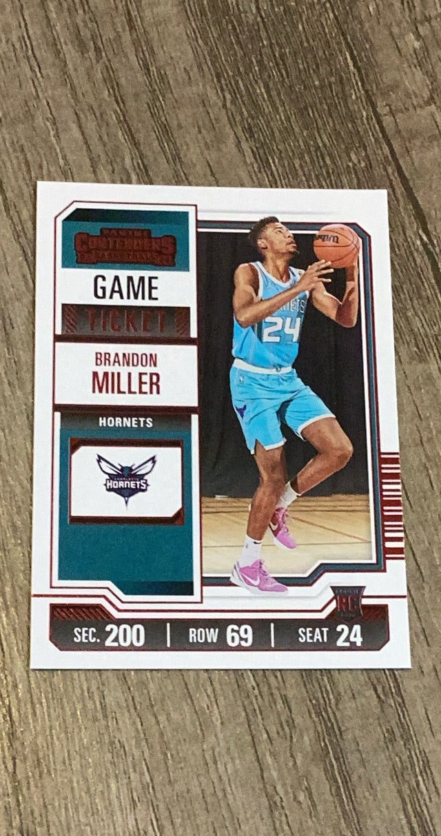 This 2023-24 Panini Contenders Game Ticket Red rookie card of Brandon Miller is a vibrant collectible for Hornets fans, featuring a stunning parallel in near mint condition. Perfect for NBA collectors!