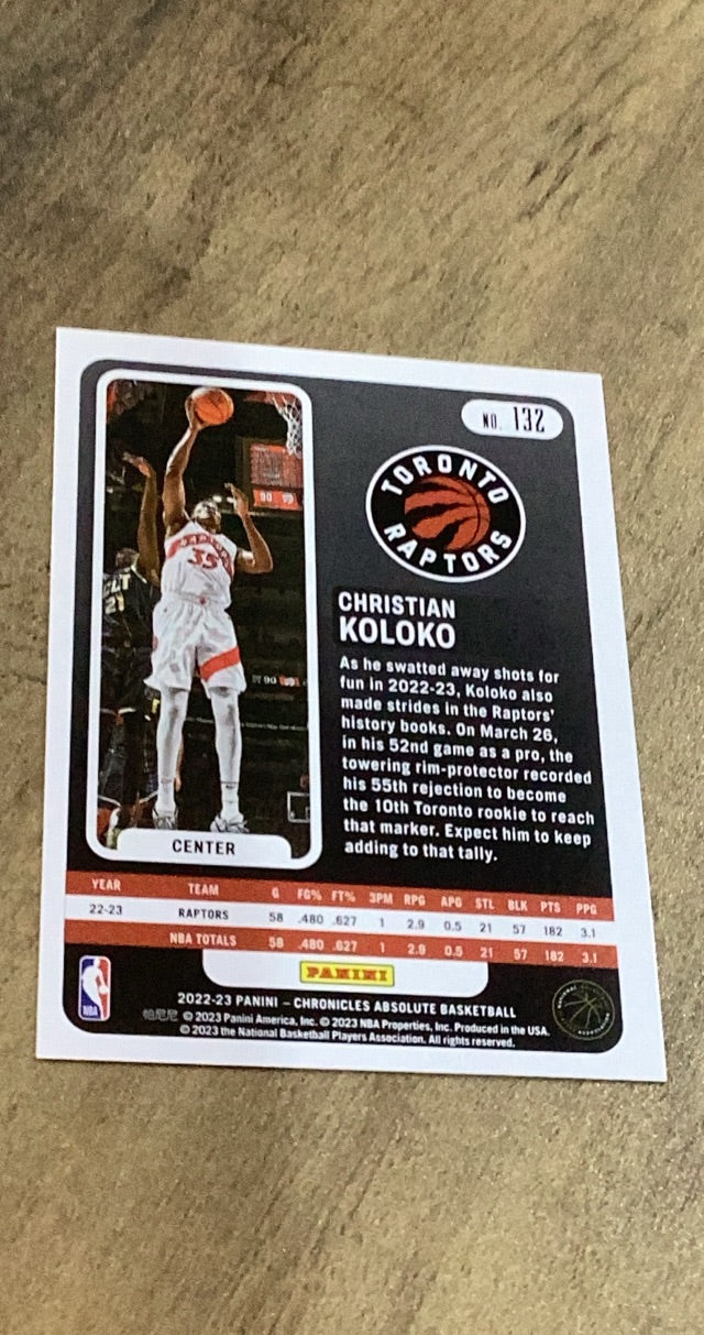 This 2022-23 Panini Chronicles Absolute Pink rookie card of Christian Koloko is a premium collectible for Toronto Raptors fans, showcasing a defensive center!