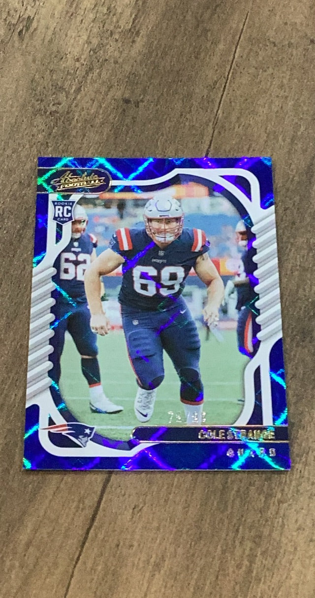 Introducing the Cole Strange New England Patriots NFL 2022 Panini Absolute: Blue 165, a must-have collectible for any football fan. This card features the talented offensive lineman, Cole Strange, showcasing his skills and dedication to the game.