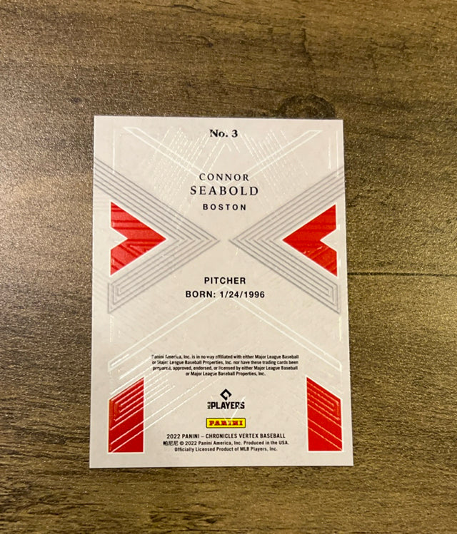 This 2022 Panini Chronicles Vertex rookie card of Connor Seabold is a vibrant collectible for Red Sox fans, showcasing a promising pitcher!