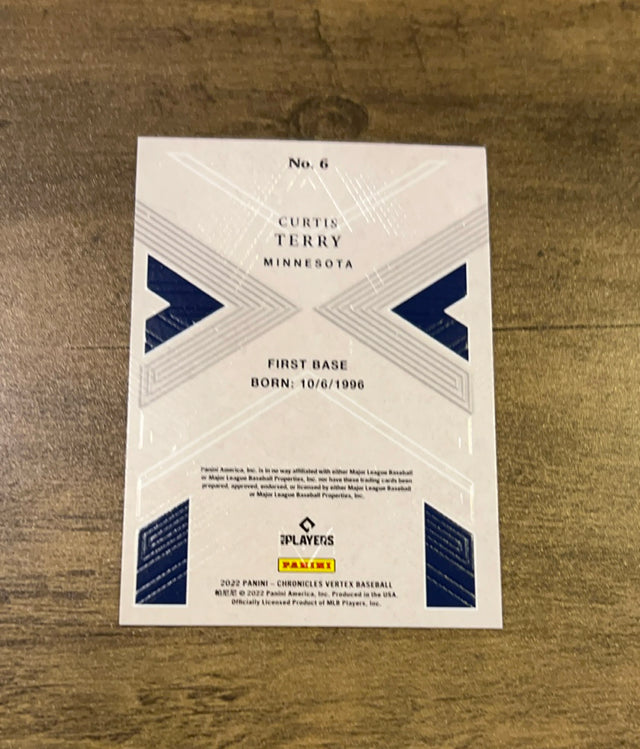 This 2022 Panini Chronicles Vertex rookie card of Curtis Terry is a vibrant collectible for Twins fans, showcasing a promising first baseman!