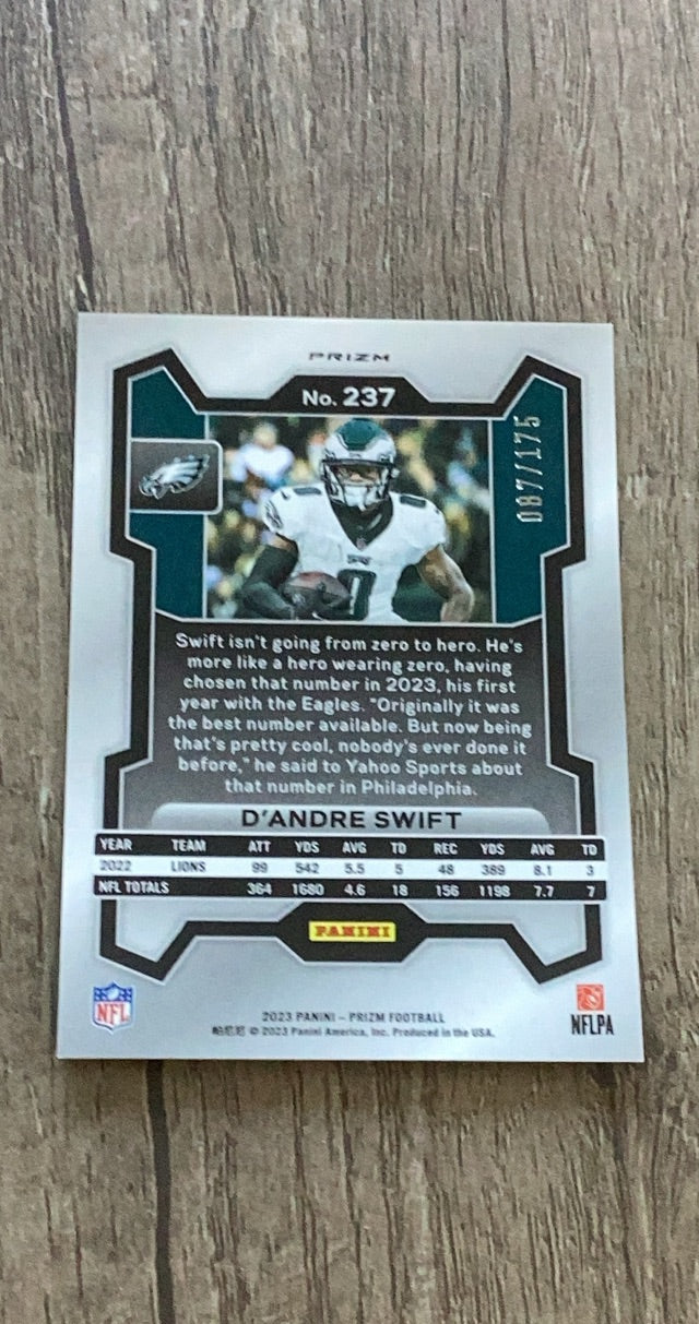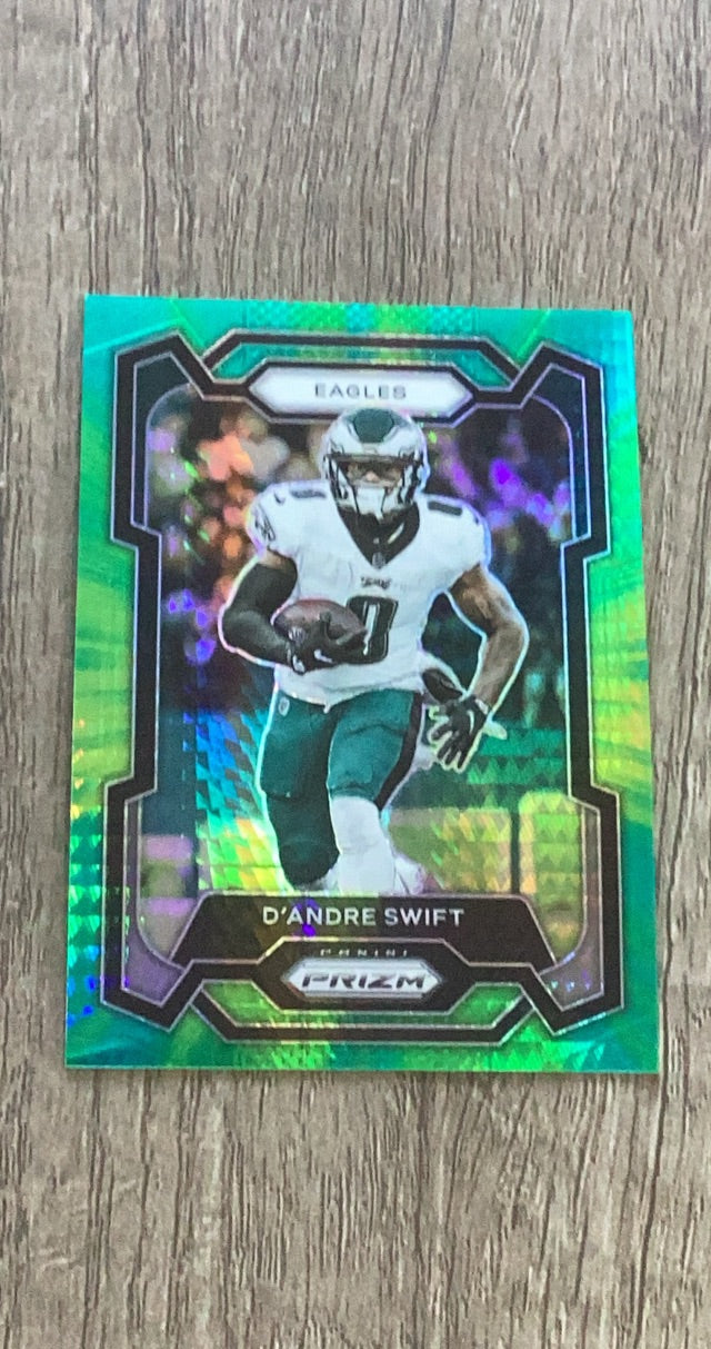 This 2023 Panini Prizm Hyper card of D'Andre Swift is a vibrant collectible for Eagles fans, featuring a limited-edition parallel in near mint condition. Ideal for NFL collectors!