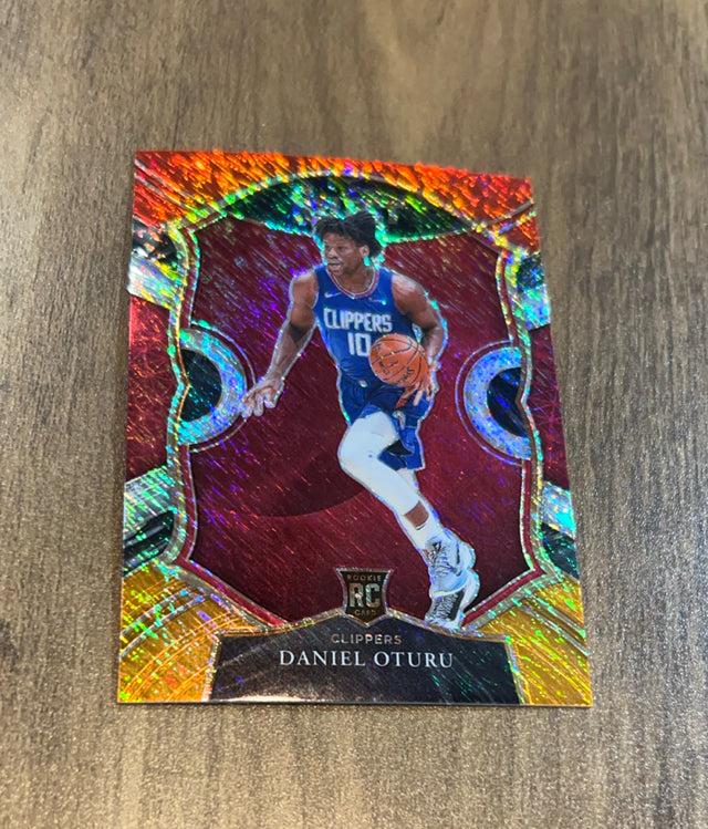 This 2020-21 Panini Select Red White Orange Shimmer parallel rookie card of Daniel Oturu is a premium collectible for Los Angeles Clippers fans, showcasing a physical young center!