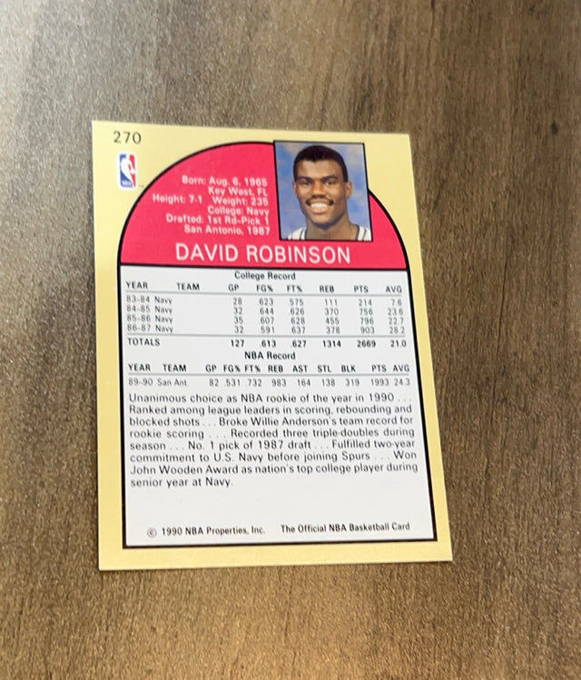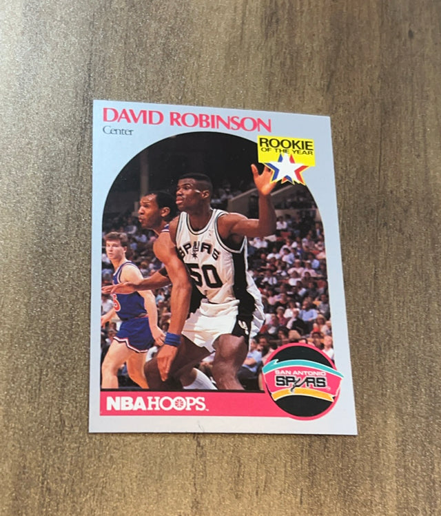 This 1990 Hoops card of David Robinson, ‘The Admiral,’ showcases the San Antonio Spurs legend’s dominance. In Near Mint condition, it’s a prized collectible for Spurs fans and NBA collectors!