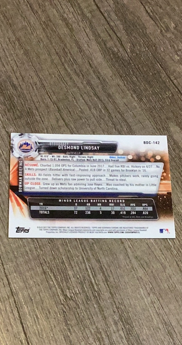 This 2017 Bowman Draft Chrome rookie card of Desmond Lindsay is a vibrant collectible for Mets fans, showcasing a rising outfielder in new condition. Ideal for MLB collectors!