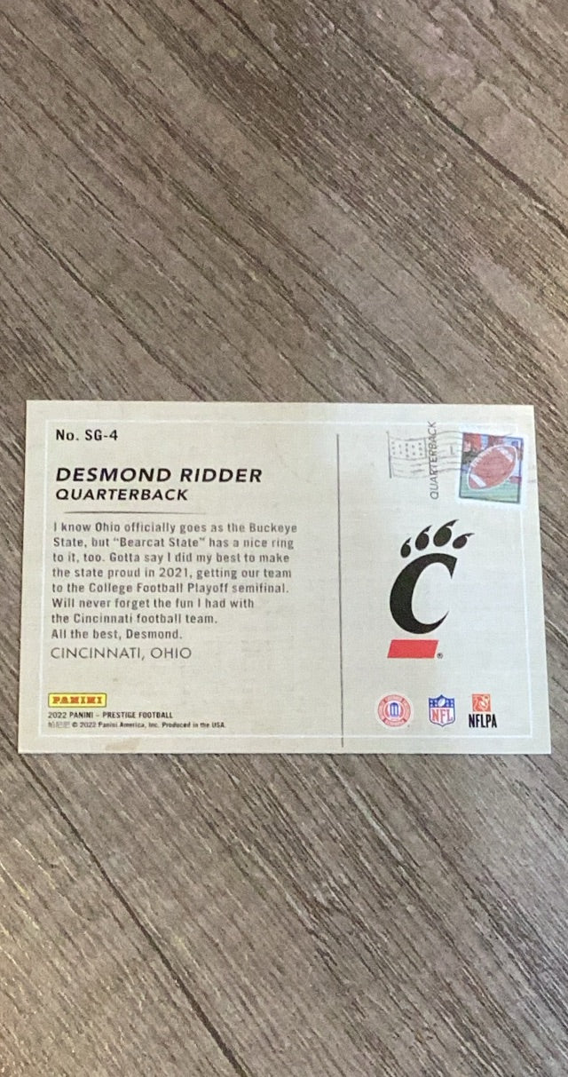 Own this 2022 Panini Prestige Seasons Greetings insert card featuring Desmond Ridder, a gem for Cincinnati Bearcats fans!