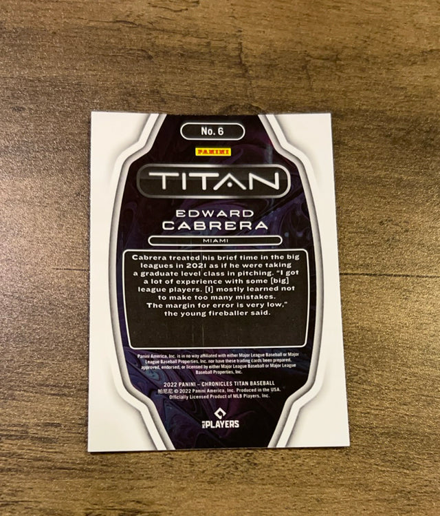 This 2022 Panini Chronicles Titan rookie card of Edward Cabrera is a vibrant collectible for Marlins fans, showcasing a promising pitcher!