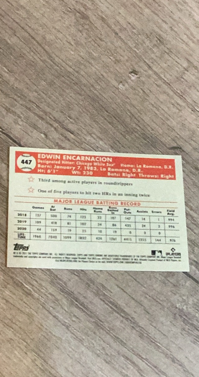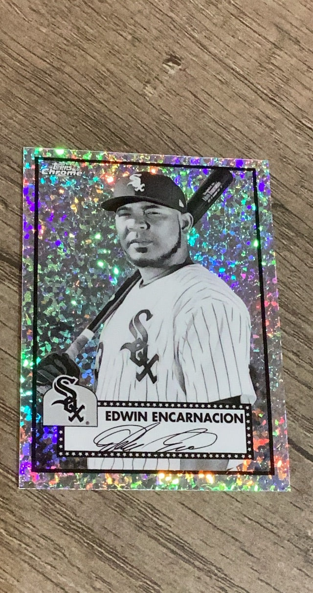 This 2021 Topps Chrome Platinum Anniversary Black & White Mini-Diamonds Refractor card of Edwin Encarnacion is a vibrant collectible for White Sox fans, featuring a unique parallel in new condition. Ideal for MLB collectors!