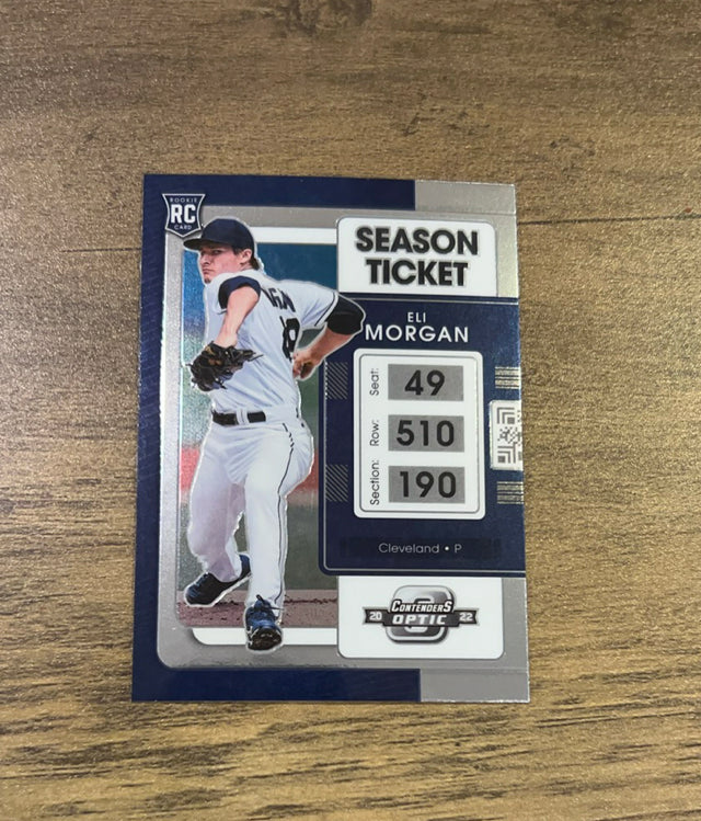 This 2022 Panini Chronicles Contenders Optic rookie card of Eli Morgan is a vibrant collectible for Guardians fans, showcasing a promising pitcher!
