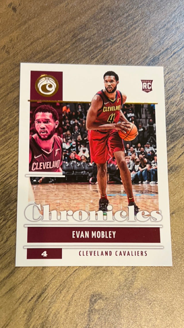 This 2021-22 Panini Chronicles rookie card of Evan Mobley is a premium collectible for Cleveland Cavaliers fans, showcasing a 2022 All-Rookie star and defensive anchor!