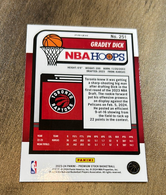 This 2023-24 Hoops Premium Stock Silver Prizm rookie card of Gradey Dick is a vibrant collectible for Raptors fans, featuring a stunning parallel in near mint condition. A must-have for NBA collectors!