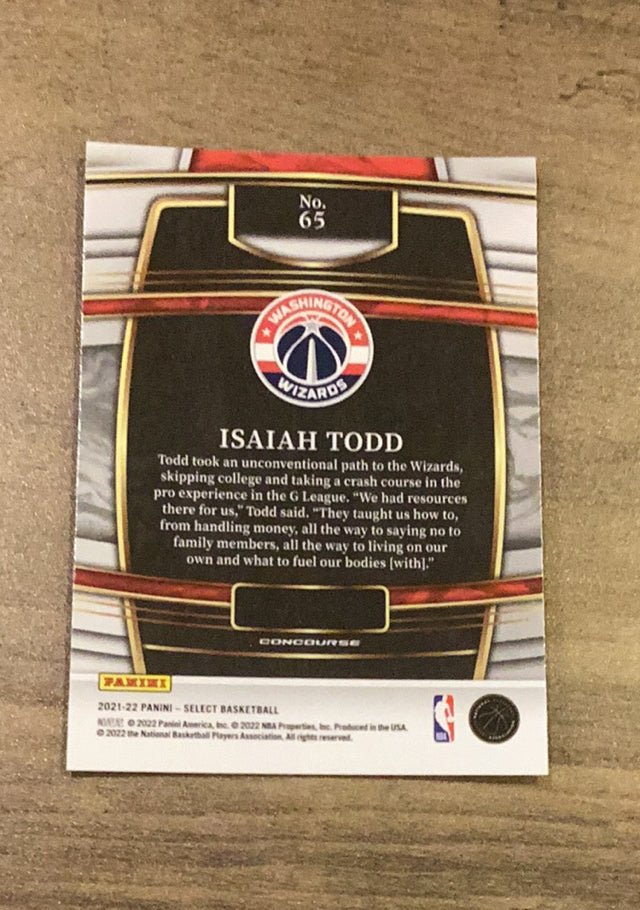 This 2021-22 Panini Select Blue Retail Base rookie card of Isaiah Todd is a vibrant collectible for Washington Wizards fans, showcasing a high-upside prospect!