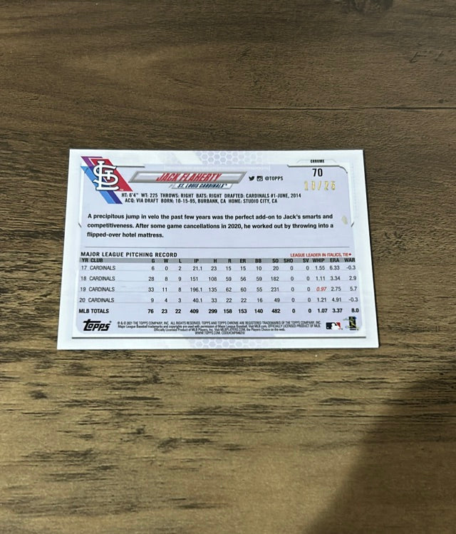This 2021 Topps Chrome Orange Wave Refractor card of Jack Flaherty is a rare collectible for Cardinals fans, featuring a limited-edition parallel in new condition. A must-have for MLB collectors!
