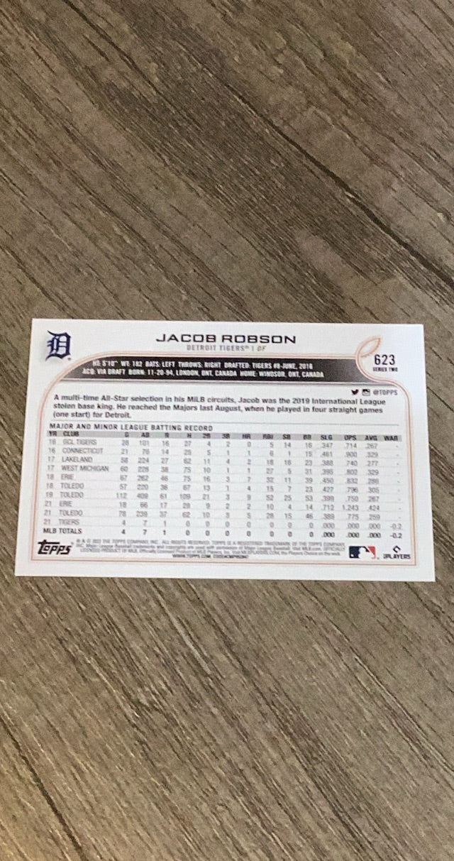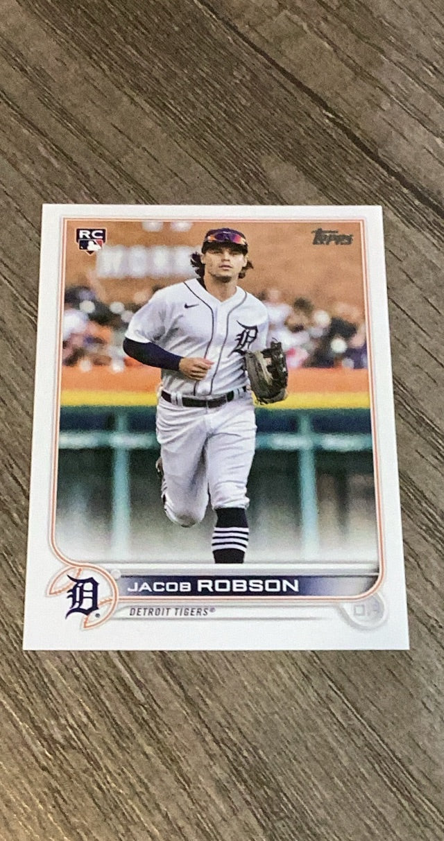 This 2022 Topps rookie card of Jacob Robson is a vibrant collectible for Tigers fans, showcasing base-running threat!