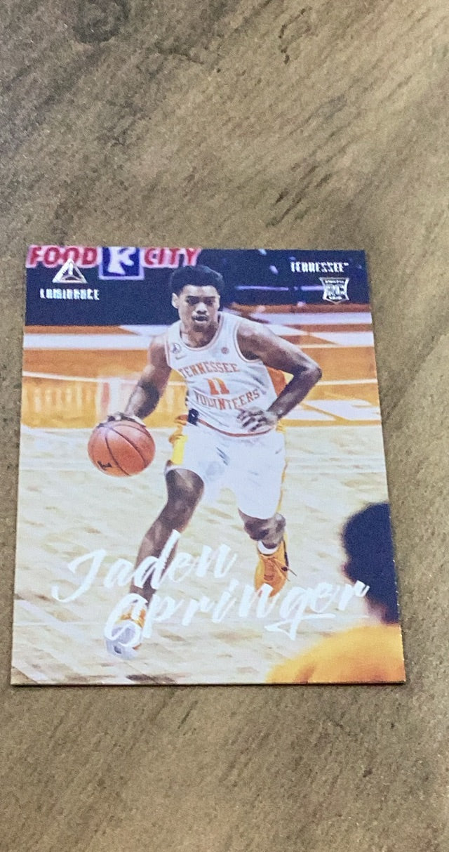 This 2021 Panini Chronicles Luminance Draft Picks rookie card of Jaden Springer is a vibrant collectible for Tennessee Volunteers and 76ers fans, in new condition!