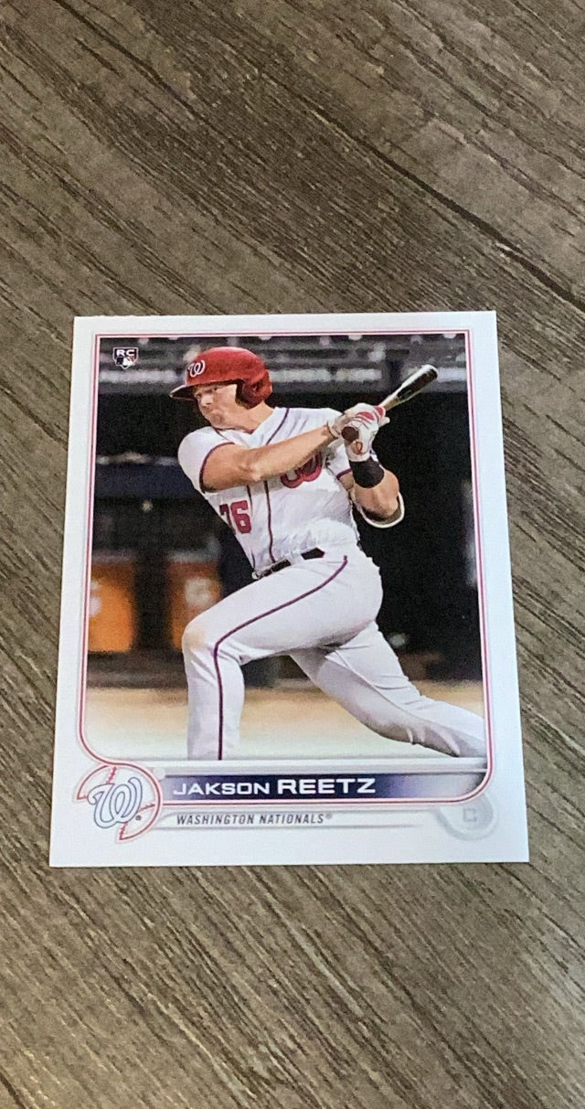 This 2022 Topps rookie card of Jakson Reetz is a vibrant collectible for Nationals fans, showcasing defensive catcher!