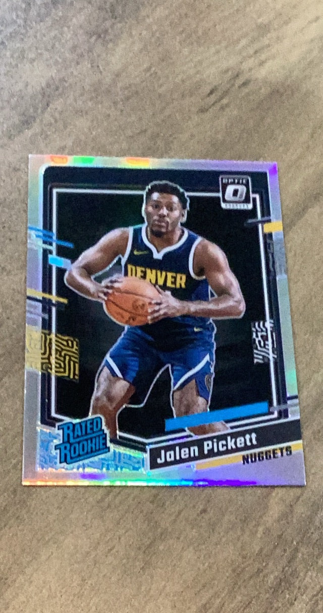 This 2023-24 Donruss Optic Holo parallel rookie card of Jalen Pickett is a shiny playmaking prospect for Denver Nuggets collectors!