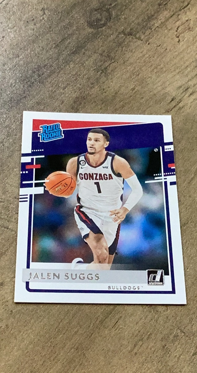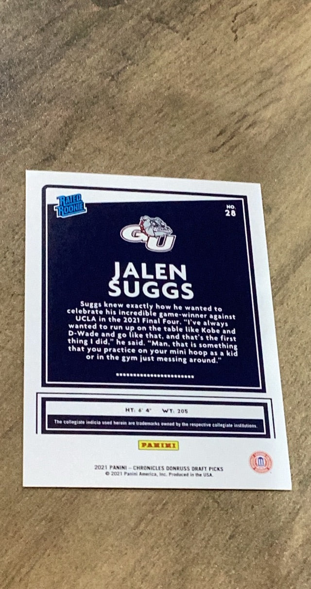 This 2021 Panini Chronicles Donruss Draft Picks rookie card of Jalen Suggs is a must-have for Gonzaga Bulldogs and Magic fans, in new condition!