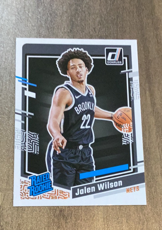This 2023-24 Panini Donruss rookie card of Jalen Wilson is a vibrant collectible for Brooklyn Nets fans, showcasing a two-way young forward!