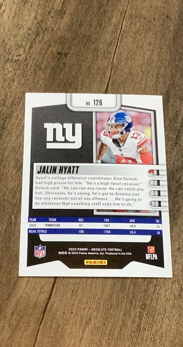This 2023 Panini Absolute Retail rookie card of Jalin Hyatt is a speedy gem for New York Giants collectors!