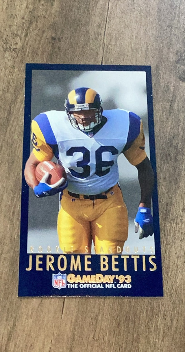 Introducing the Jerome Bettis Los Angeles Rams NFL 1993 GameDay - Rookie Standouts 4, a must-have for any football enthusiast. This collectible card captures the essence of Bettis's rookie season, showcasing his dynamic playing style and potential.