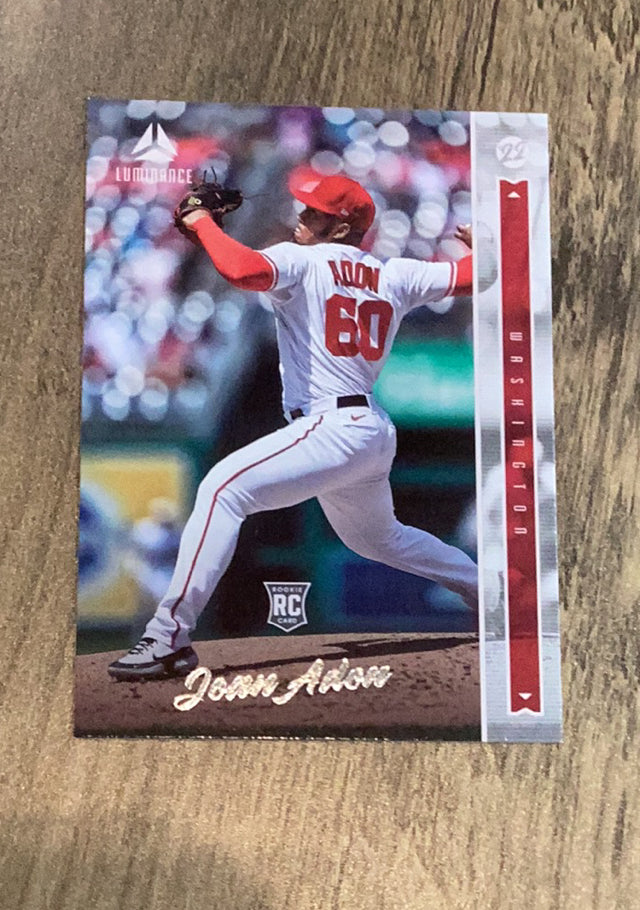 This 2022 Panini Chronicles Luminance rookie card of Joan Adon is a vibrant collectible for Nationals fans, showcasing a promising pitcher!