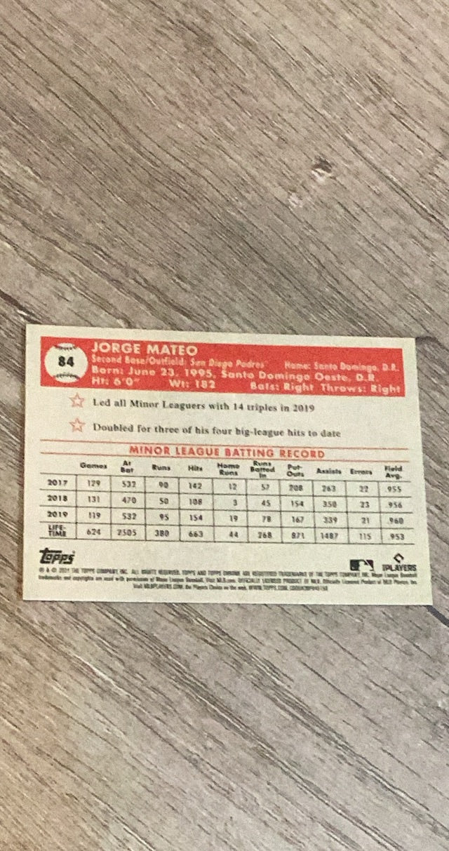 This 2021 Topps Chrome Platinum Anniversary rookie card of Jorge Mateo is a vibrant collectible for Padres fans, showcasing a speedy infielder in new condition. Perfect for MLB collectors!