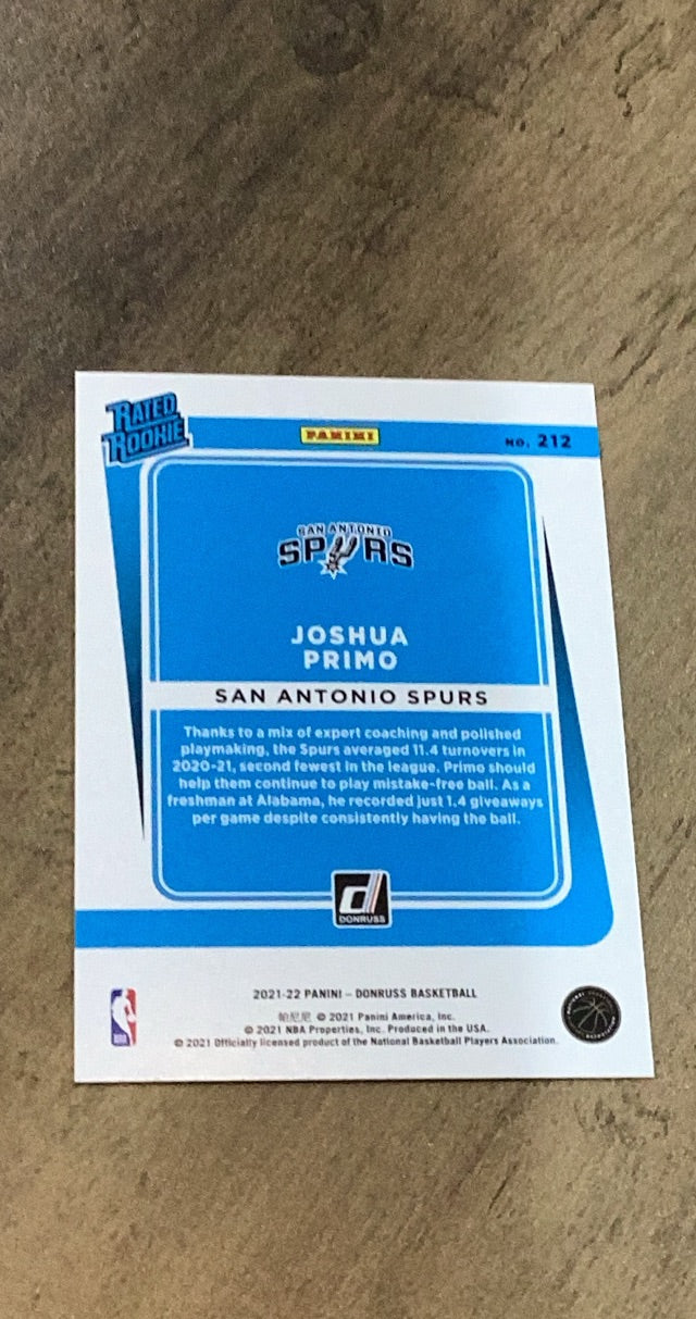 This 2021-22 Panini Donruss Holo Pink Laser rookie card of Joshua Primo is a premium collectible for San Antonio Spurs fans, showcasing the youngest player in the 2021 draft class!