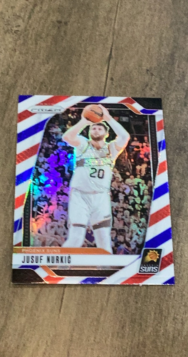 This 2024-25 Panini Prizm Red White and Blue parallel card of Jusuf Nurkic is a patriotic powerhouse for Phoenix Suns collectors!