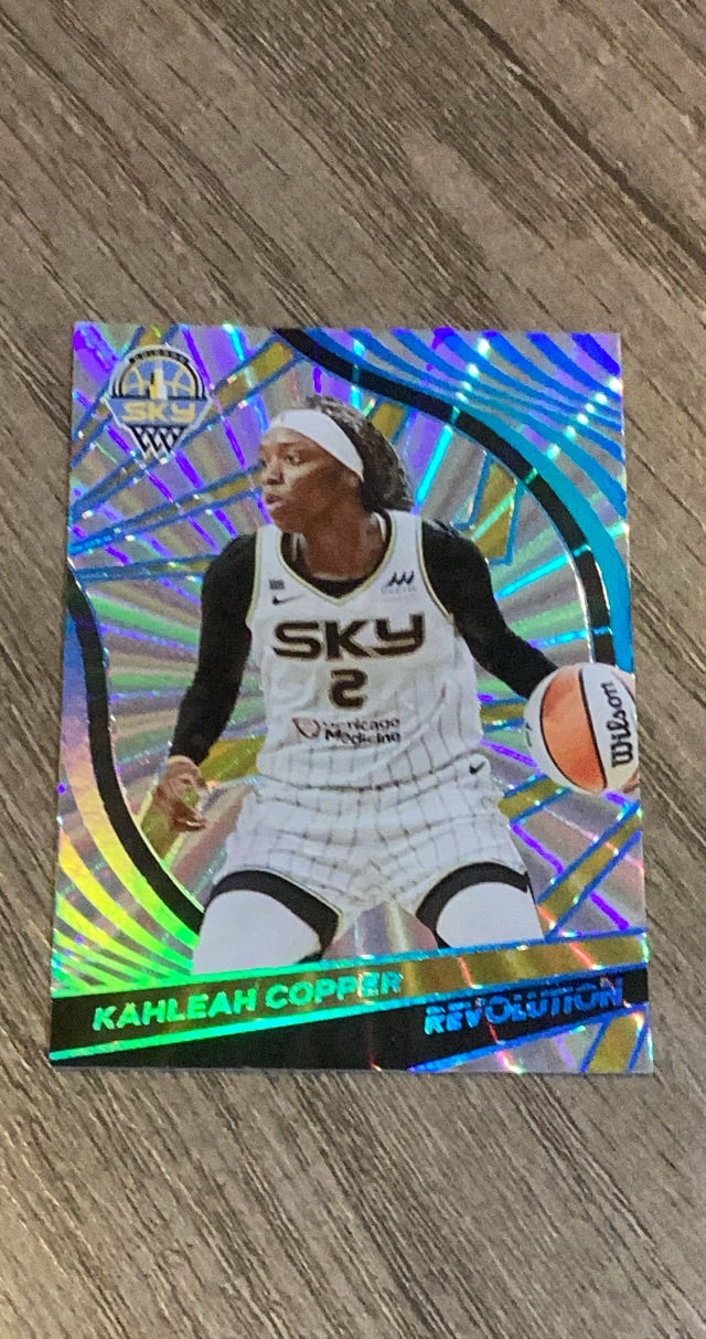 This 2022 Panini Revolution WNBA Sunburst card of Kahleah Copper, serial numbered to 75, is a premium collectible for Chicago Sky fans, showcasing a 2021 WNBA Finals MVP!