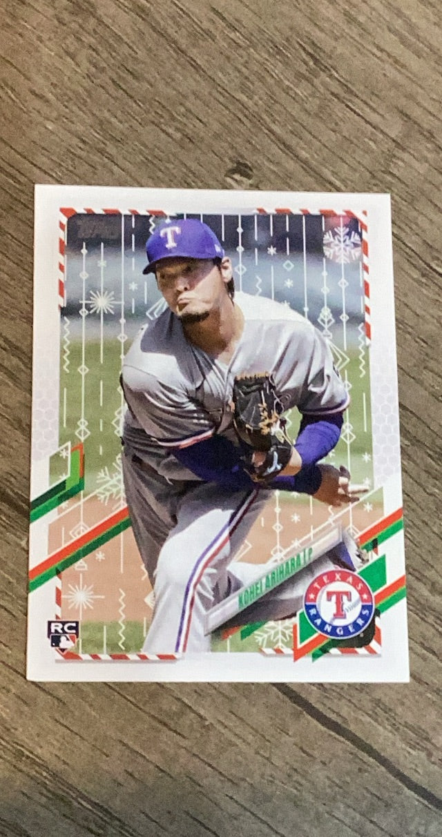 This 2021 Topps Holiday rookie card of Kohei Arihara is a vibrant collectible for Rangers fans, showcasing a young pitcher in new condition. Perfect for MLB collectors!