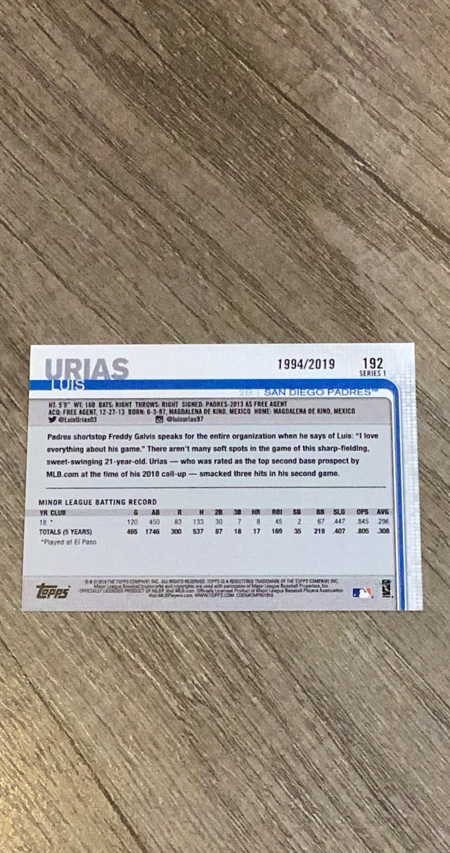 This 2019 Topps Gold rookie card of Luis Urias is a vibrant collectible for Padres fans, featuring a limited-edition parallel in new condition. Perfect for MLB collectors!