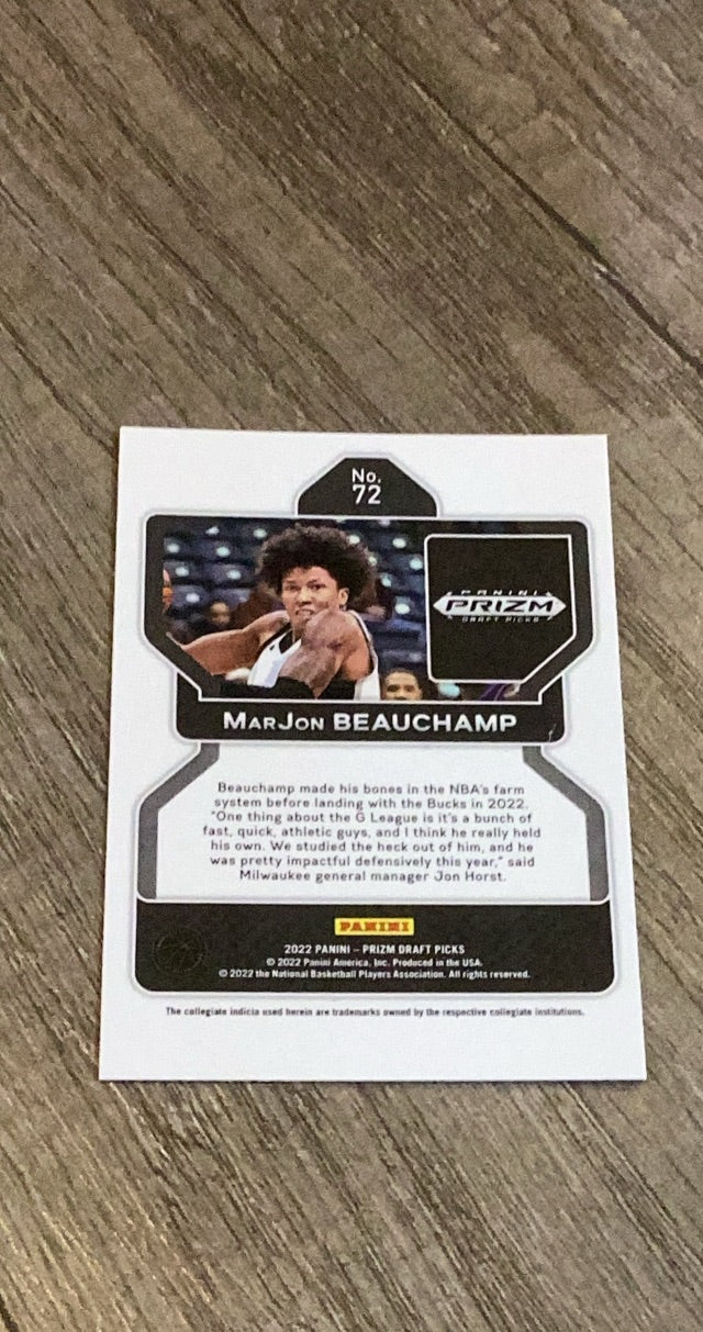 This 2022 Panini Prizm Draft Picks rookie card of MarJon Beauchamp is a vibrant collectible for Milwaukee Bucks fans, showcasing an athletic wing with potential!