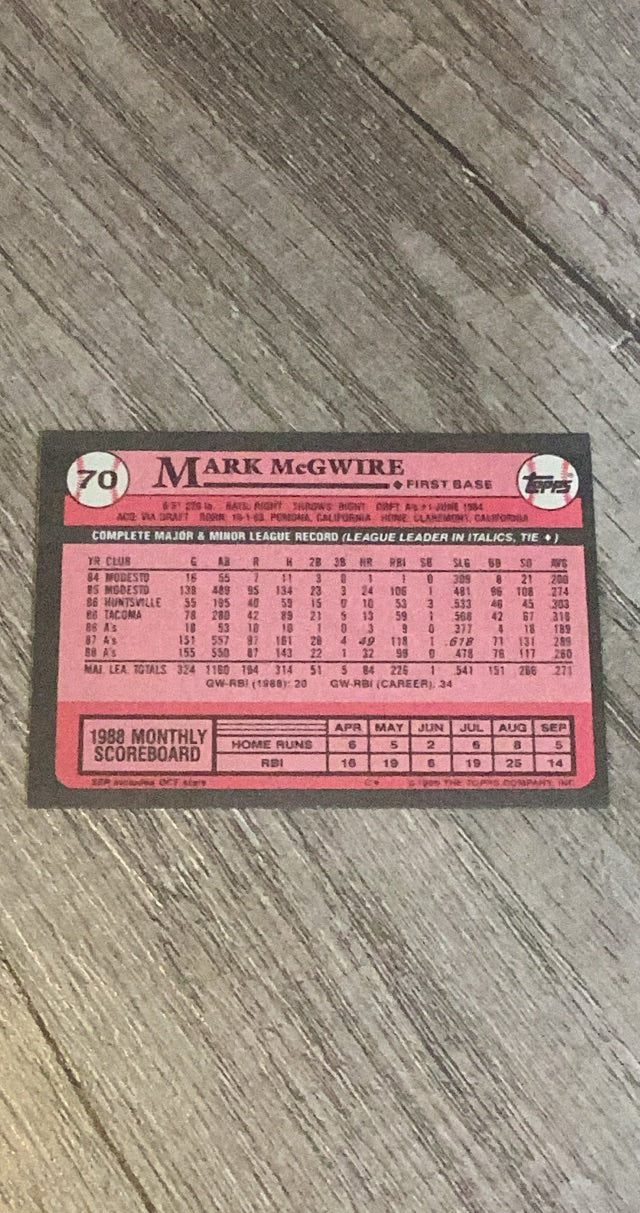 This 1989 Topps card of Mark McGwire is a vibrant collectible for Athletics fans, showcasing a baseball legend!