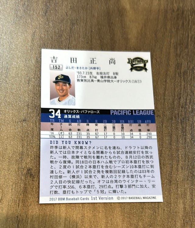 This 2017 BBM card of Masataka Yoshida is a unique collectible for international baseball fans, showcasing a rising star!