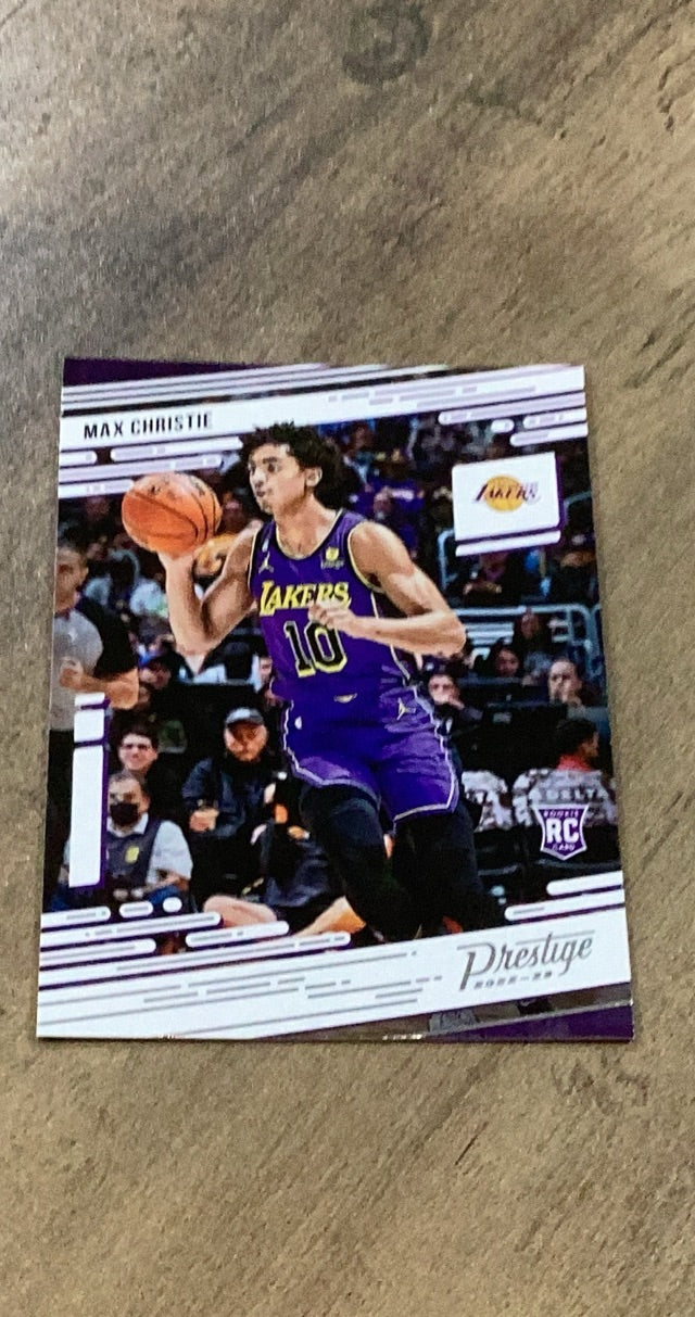 This 2022-23 Panini Chronicles Prestige rookie card of Max Christie is a vibrant collectible for Los Angeles Lakers fans, showcasing a defensive young wing!