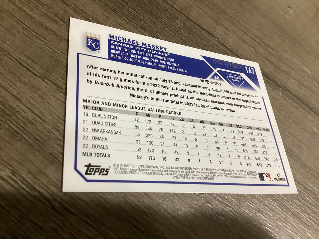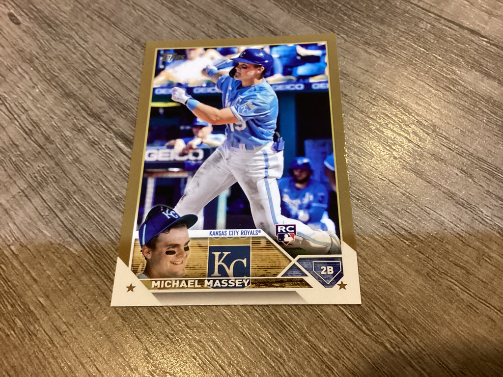 Introducing the Michael Massey Kansas City Royals MLB 2023 Topps - Gold 167 SN2023, a must-have for any baseball card collector. This limited edition card features a stunning gold finish, highlighting Massey's impressive skills on the field.