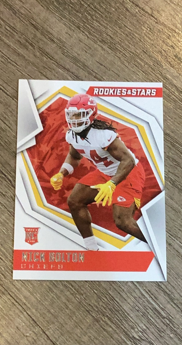 This 2021 Panini Rookies & Stars rookie card of Nick Bolton highlights his tackling prowess, vital for Chiefs fans!