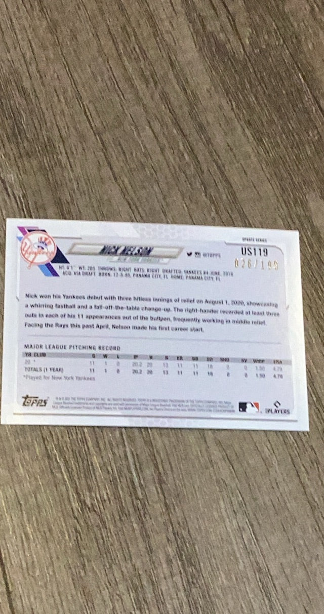 This 2021 Topps Update Red Foilboard rookie card of Nick Nelson is a vibrant collectible for Yankees fans, featuring a limited-edition parallel in new condition. Perfect for MLB collectors!