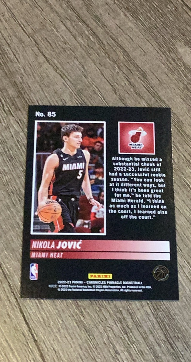 This 2022-23 Panini Chronicles Pinnacle rookie card of Nikola Jovic is a vibrant collectible for Miami Heat fans, showcasing a versatile forward with potential!