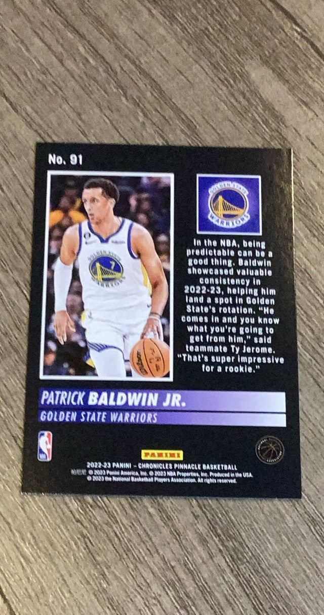 This 2022-23 Panini Chronicles Pinnacle rookie card of Patrick Baldwin Jr. is a vibrant collectible for Golden State Warriors fans, showcasing a sharpshooting forward with potential!